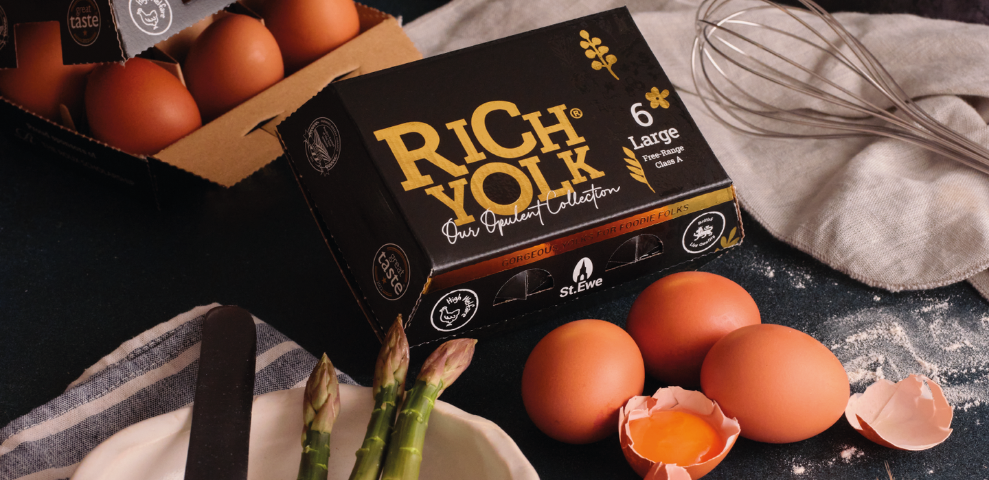 The Rich Yolk Opulent Collection has a striking premium look boasting embossed gold detail to symbolise the acclaimed deep orange yolks, and paying homage to their dedicated likeminded family farmers, who go above and beyond to achieve St. Ewe’s high standards of quality and welfare. Their hens’ come first and always will.