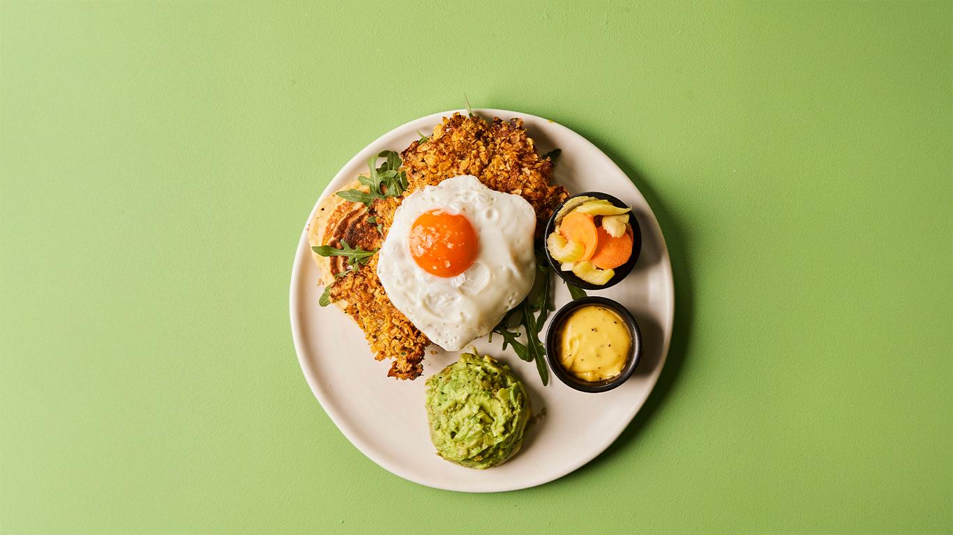 🥞 The CFC – Gather your family and friends and enjoy The CFC – crispy cornflake fried chicken, fluffy buttermilk pancakes, and a golden St. Ewe Rich Yolk egg. Indulgent, hearty, and utterly delicious! Recipe in collaboration with Where The Pancakes Are.