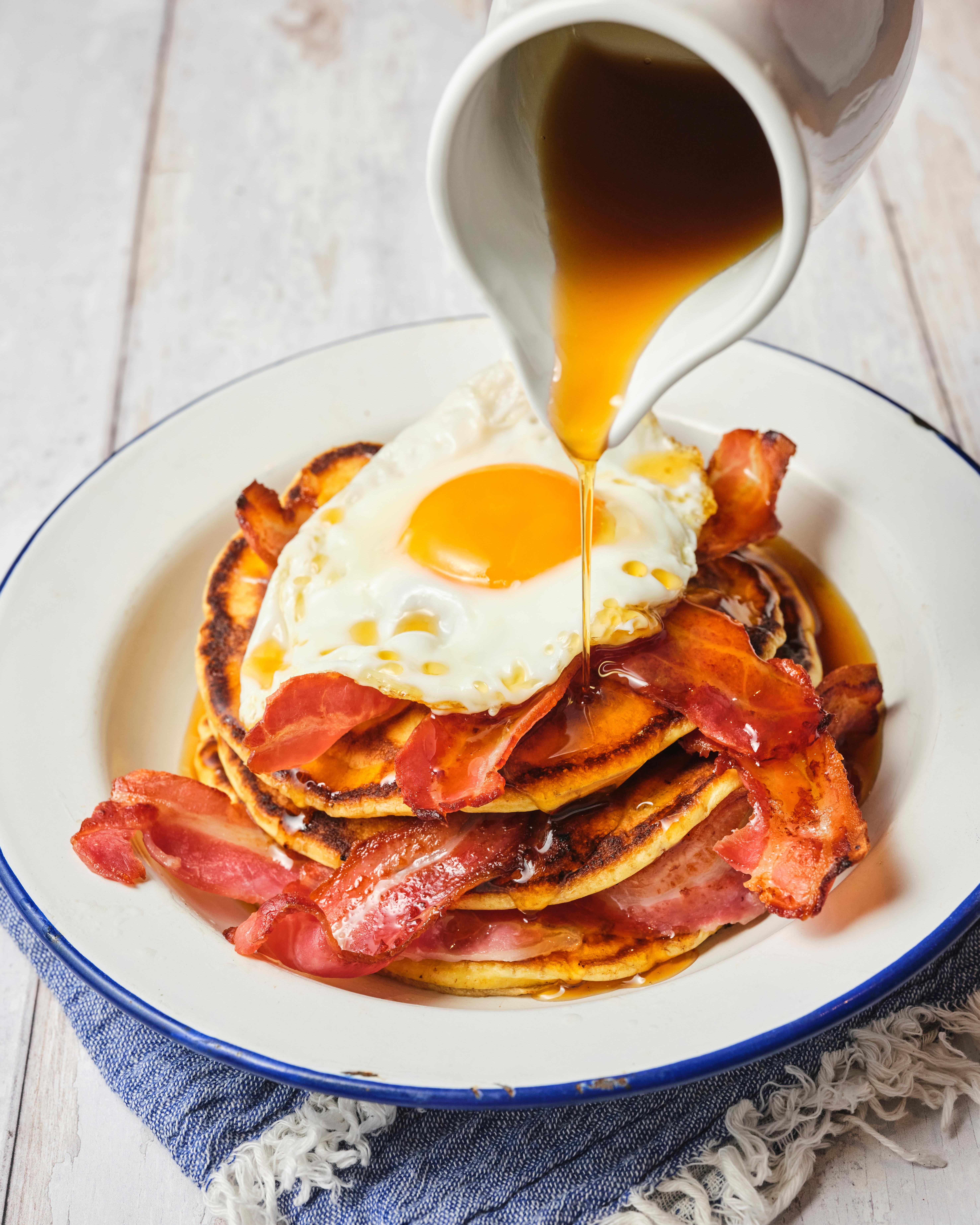 🥞 Bacon & Egg Stack - Fluffy American-style pancakes layered with crispy bacon and syrup, topped with a perfectly fried St. Ewe Rich Yolk Egg for the ultimate breakfast indulgence.