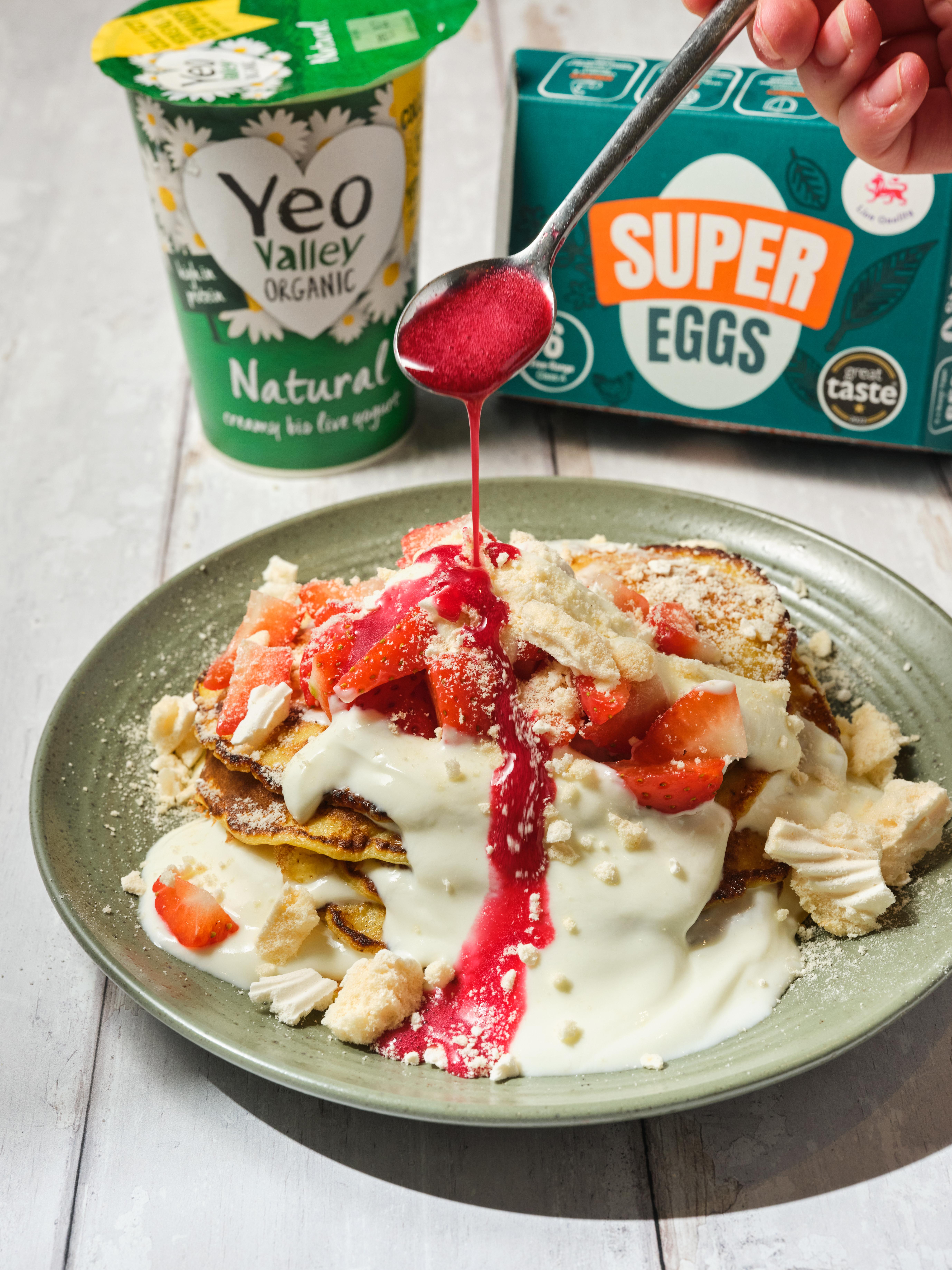 🥞 Eton Mess Pancake Stack - Light and fluffy pancakes made with Yeo Valley yogurt, stacked with a fresh berry jus, crushed meringues, and topped with fresh berries and optional cream for an indulgent treat!
