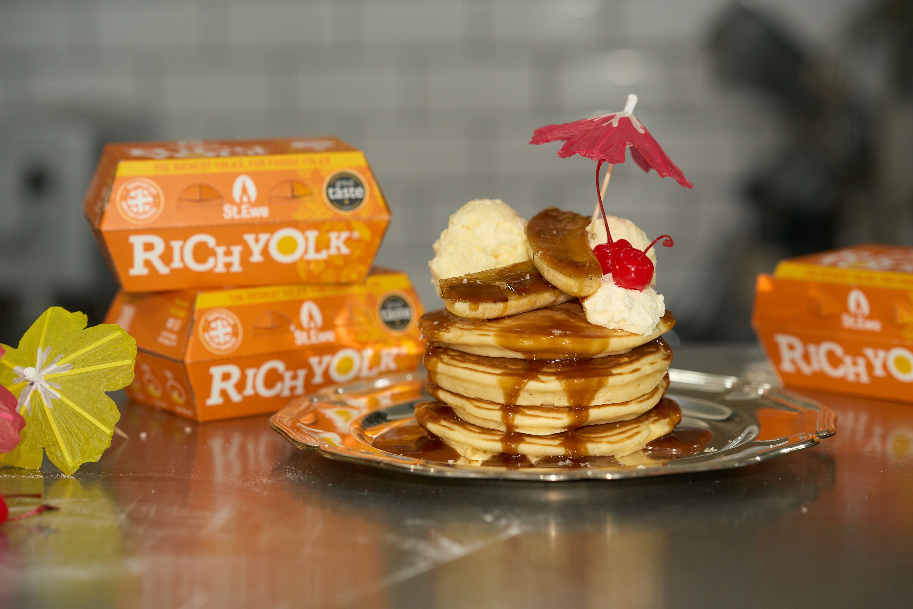 - - Step 8Slice bananas in half lengthways, sprinkle with caster sugar, and brûlée until caramelised. Add the brûléed bananas to the stack and top with maraschino cherries. Finish with a cocktail umbrella (optional, but highly encouraged!).
