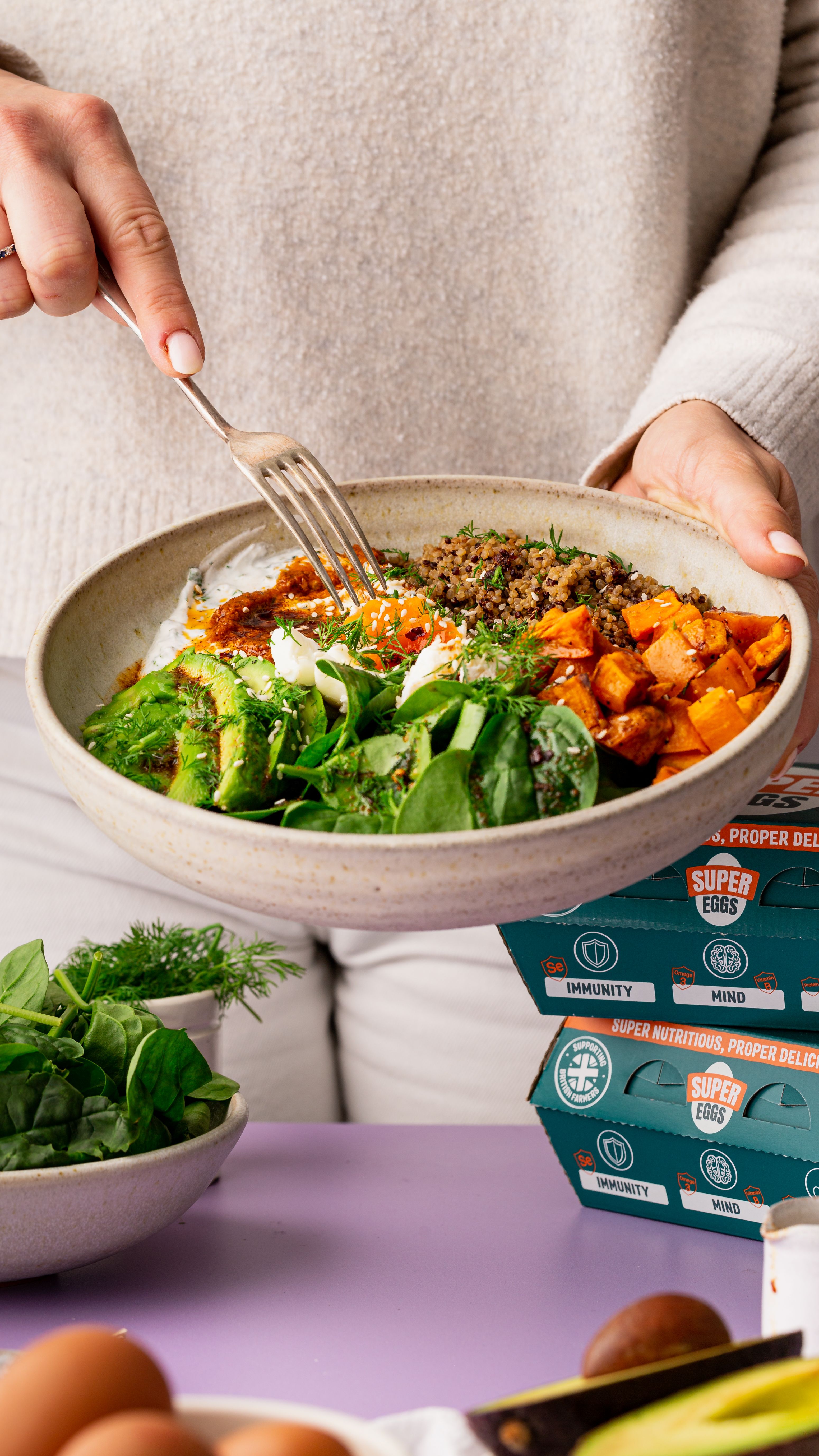 Serves: 2 PeopleA nourishing, protein-packed bowl featuring creamy yogurt herb sauce, sun-dried tomato pesto, and perfectly poached St. Ewe Super Eggs. A vibrant, flavourful start to the day.