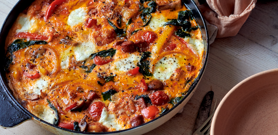 Serves: 4 PeoplePaul and Emma will make this gluten free dish most weekends for breakfast or brunch. It is the perfect treat for enjoying after a morning bike ride or beach walk. Paul and Emma use up whatever is in their fridge and suggest using chopped roast chicken thighs as a lovely alternative to chorizo. If you are working to a budget, then frozen cocktail prawns are a great option too. Feel free to mix it up and tag us in your creations!