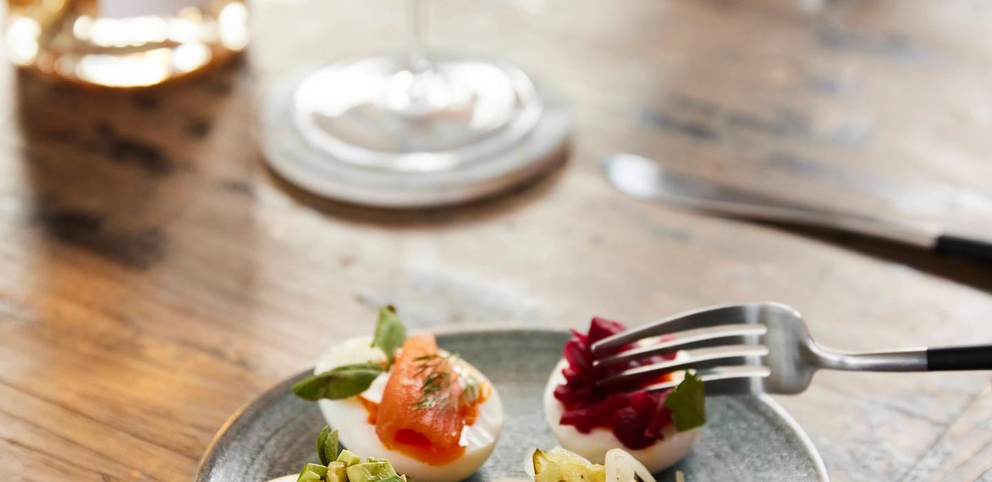 - - Step 3Flavour Magic: Top the first egg with smoked salmon and fresh dill, the second with Vadasz’s vibrant super beet kimchi, and the third with creamy cubed avocado.