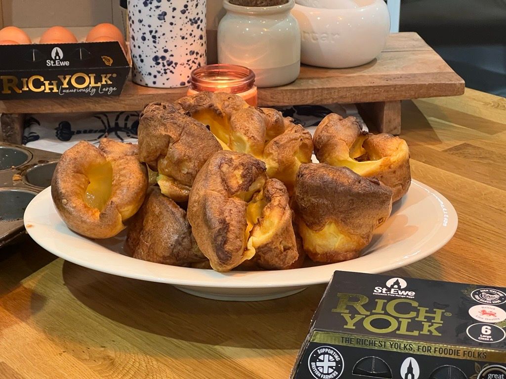 Serves: 12 YorkiesThese perfectly risen Yorkshire puddings are made extra golden and indulgent with St. Ewe Luxuriously Large Rich Yolk eggs. Light, crisp, and beautifully fluffy - the ultimate addition to your Sunday roast or Christmas dinner.